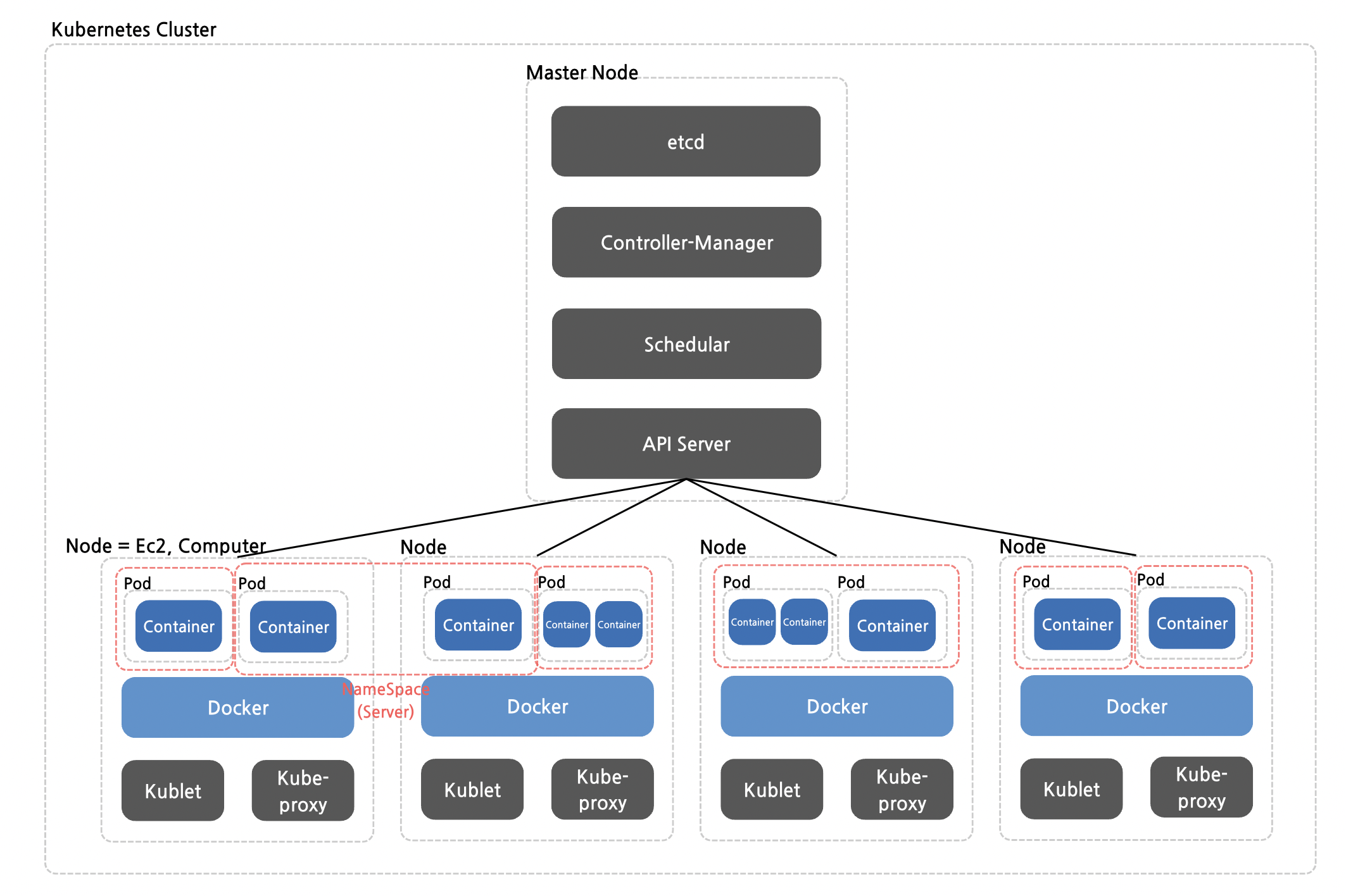 마스터노드에 있는 API 서버로 유저의 요청을 받아 각 워커노드들에 명령을 내리고, controller manager를 통해 각 노드들의 자원 상황을 고려하여 적절히 pod를 분배합니다.