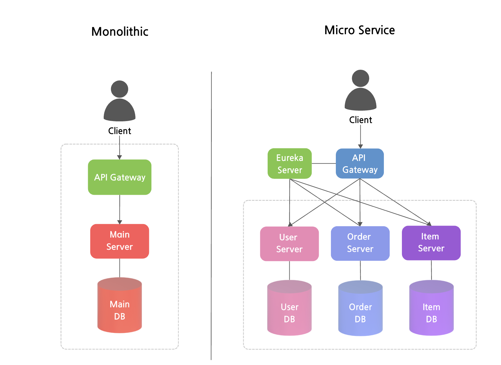 하나의 서버로만 이루어져있던 기존의 서버 구조(모놀리식 구조)를 기능을 기준으로 여러 개로 나누어 365일 24시간 서비스가 기동할 수 있도록 만들기 위해 등장한 아키텍처 구조입니다.