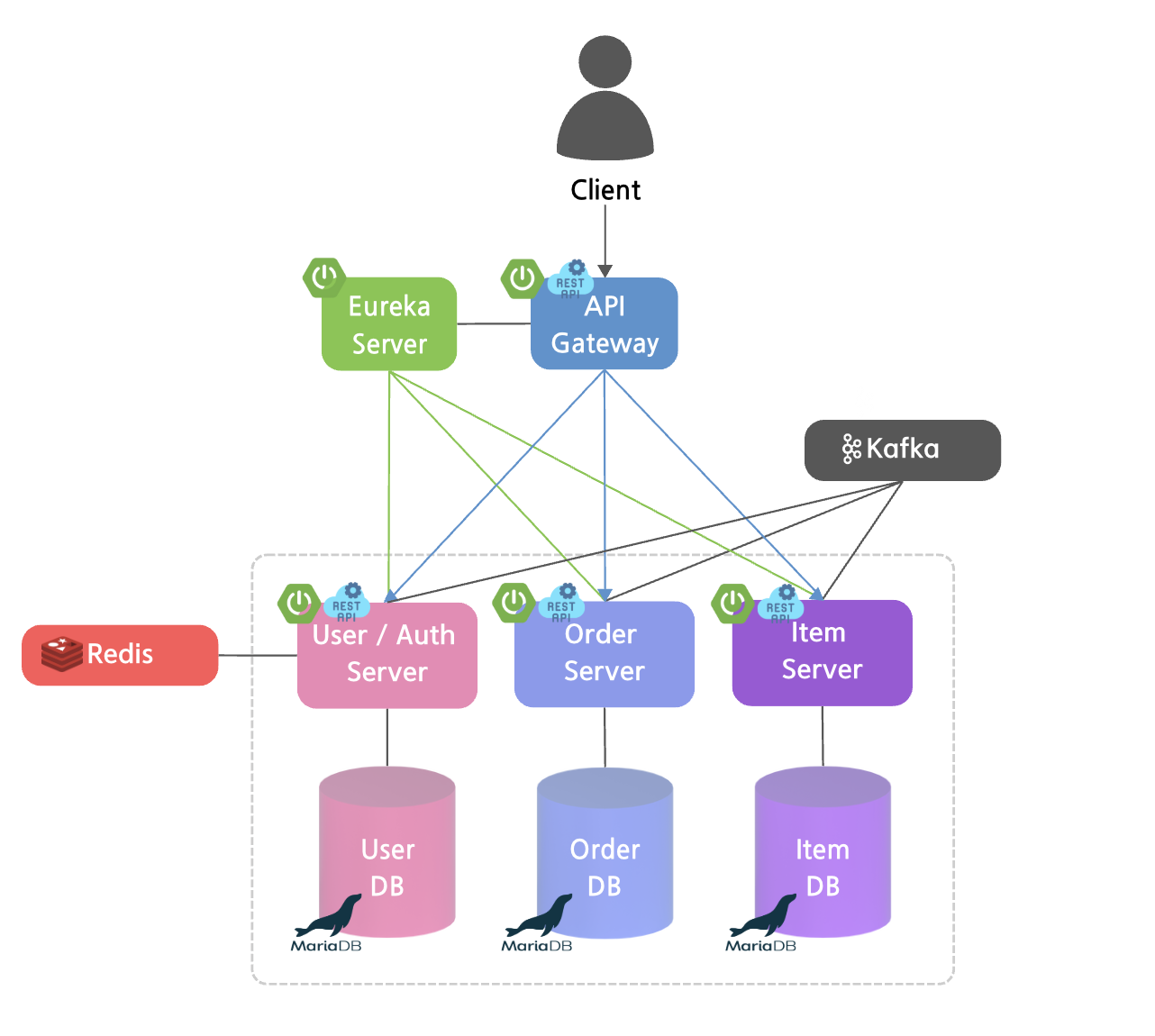 - 서비스 간 통신: REST API / Kafka 이벤트 기반 통신