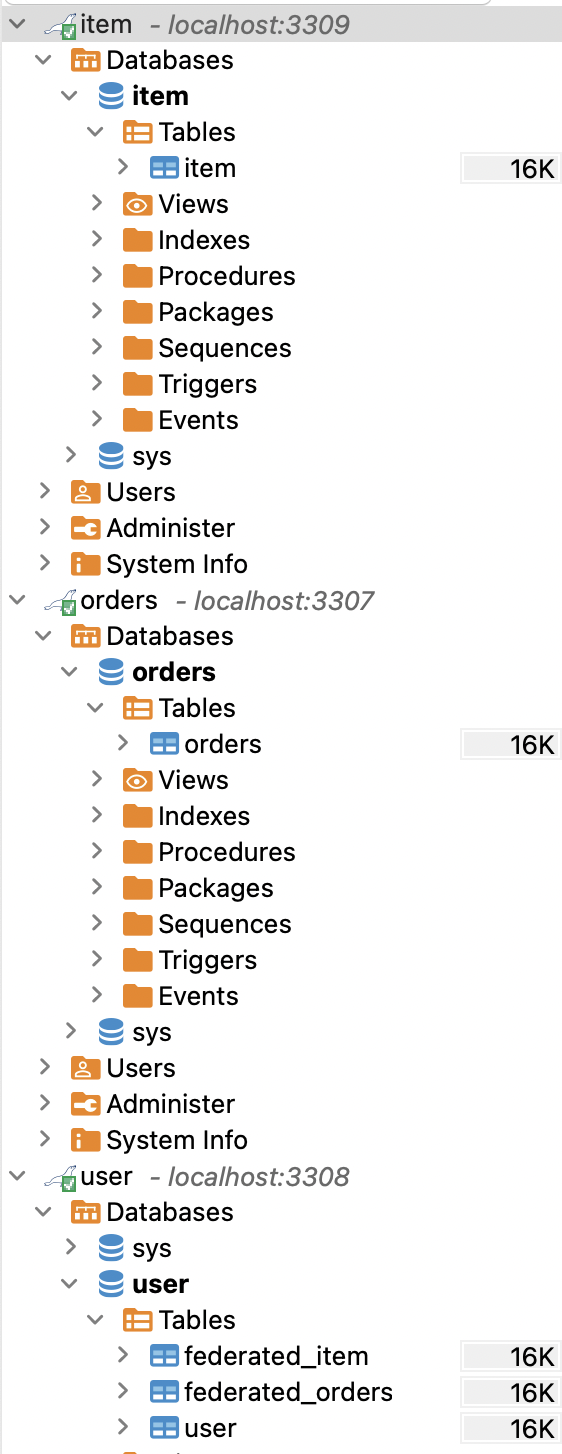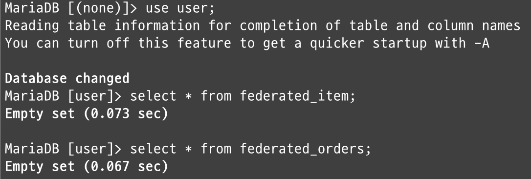 user-db 는 order-db 와 item-db 가 생성된 이후에 federated 엔진을 통해 테이블을 생성해야 하기 때문에 healthcheck 를 수행하여 두 컨테이너가 정상적으로 생성된 이후에 생성되도록 설정하였습니다
