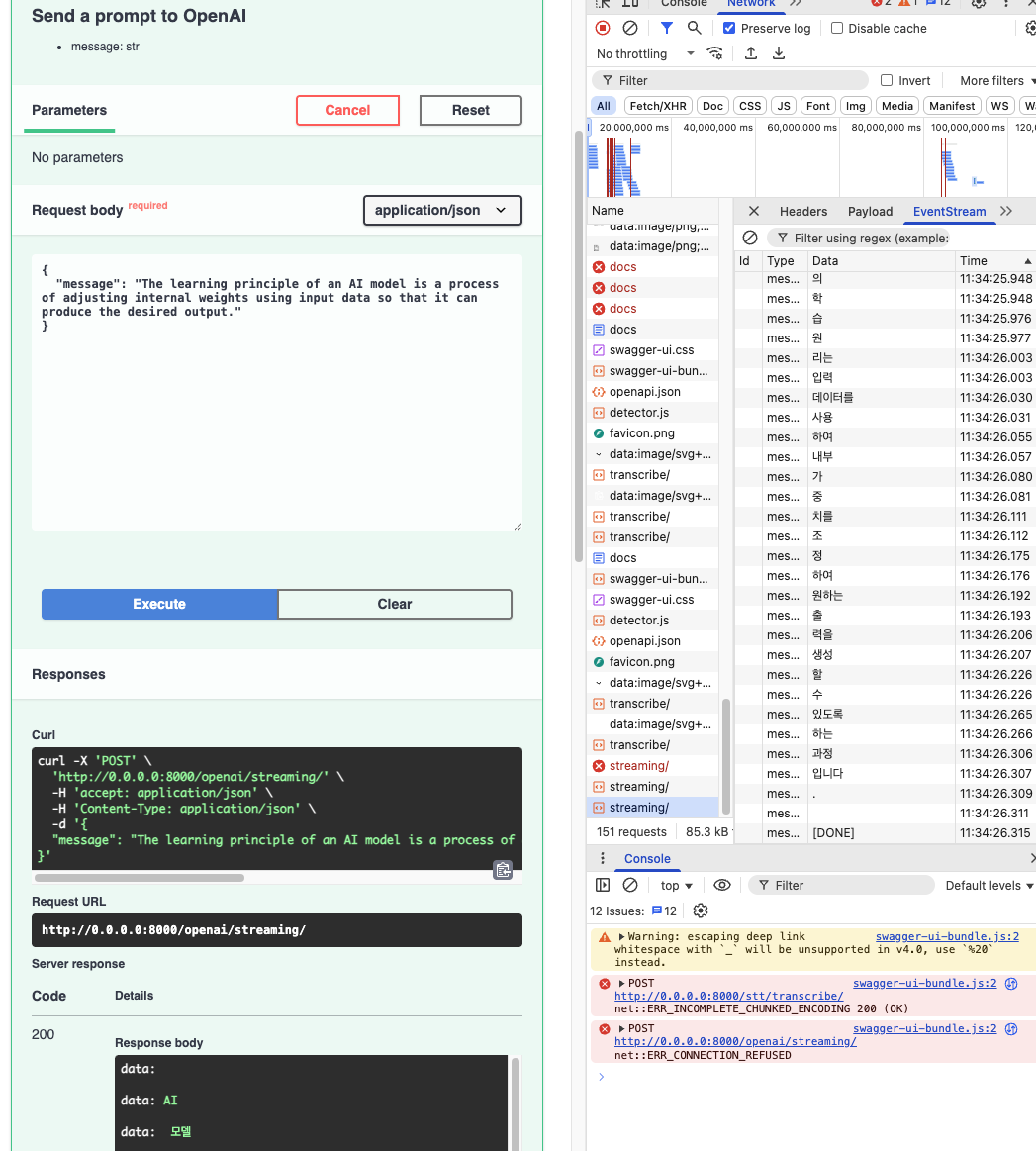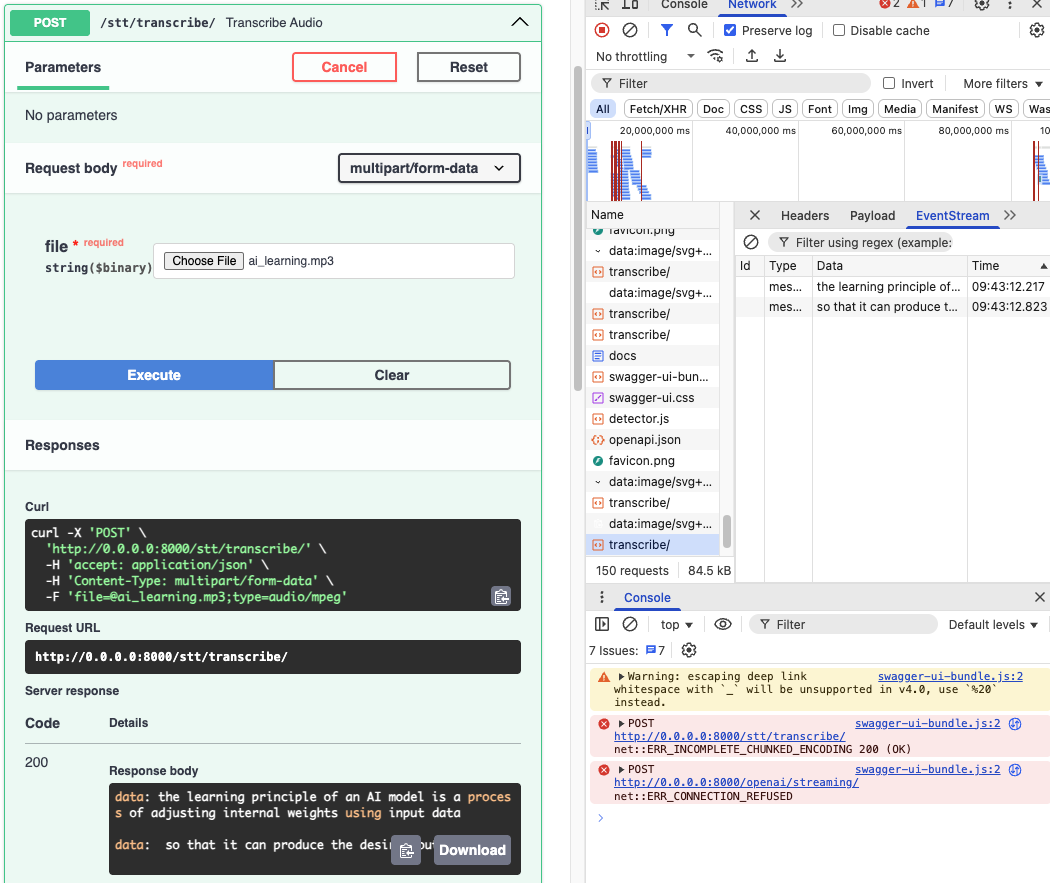 STT 역시 StreamingResponse를 통해 실시간으로 결과 값을 반환하도록 설정했습니다.